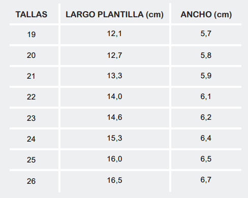 Tallas= Größen, Largo Plantilla: Länge Innensohle, Ancho= Breit